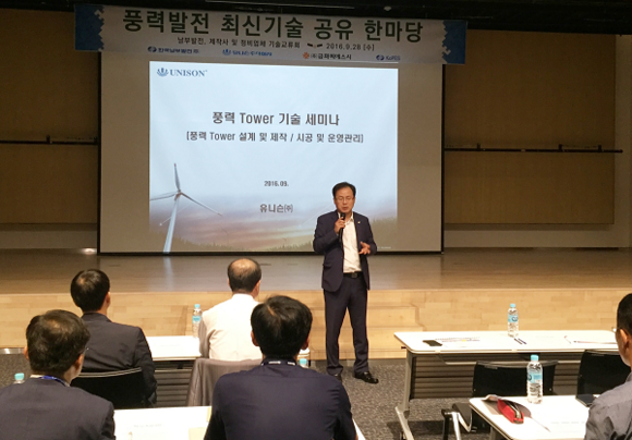 이 자리에서 풍력발전기 제작에서 건설 및 유지보수까지 전반에 걸쳐 업무를 추진하는 유니슨은 풍력발전기 설계 및 시공방법에 대한 정보를 제공하였으며, 국내 최대 규모의 풍력단지(총105MW, 51기)를 운영하고 있는 남부발전은 국제풍력센터의 원격감시 운영 현황과 고장예방 및 분석기술을 소개했다.