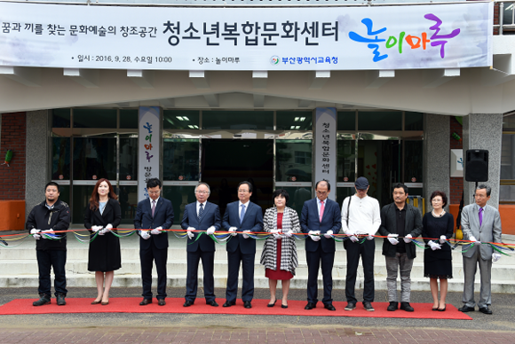 부산지역 학생들의 문화․예술과 진로의 융합형 체험공간인 청소년복합문화센터 '놀이마루'가 28일 오전 10시 교육청 관계자와 교직원, 학생, 학부모, 재능기부 작가 등이 참석한 가운데 개관식을 갖고 본격 운영에 들어갔다.