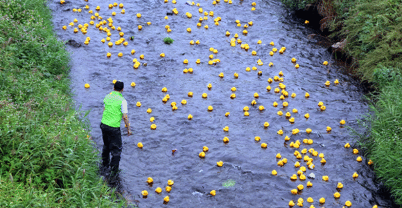 ▲오리 인형을 띄어 경주를 진행하고 있다