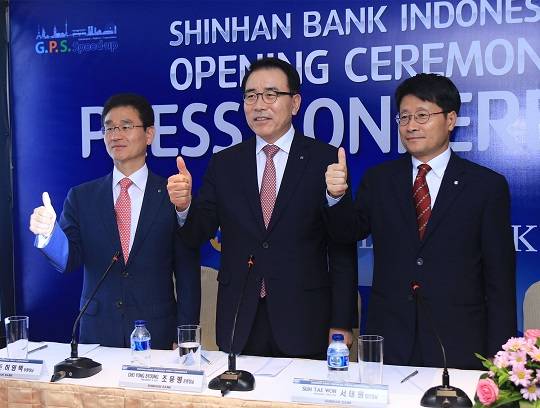 ▲인도네시아가 거대 신흥시장으로 부상하면서 국내 금융사들이 앞다퉈 현지에 진출하고 있는 가운데, 이번 코린도그룹의 환경파괴 의혹으로 한국기업들의 이미지 실추가 우려되고 있다. 지난 5월 신한인도네시아은행 출범식에 참석한 조용병 신한은행장(가운데)과 임원진. (사진=신한은행)
