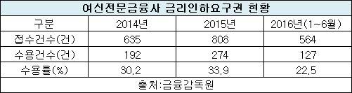 국회정무위 김관영 의원(국민의당)이 금융감독원으로부터 제출받은 자료에 따르면 2014년부터 올해 6월까지 여신전문금융사(54개)에 접수된 금리인하요구는 모두 2007건으로 이 중 29.5%인 593건만 수용됐다. 올해 상반기만 따지면 더 낮았다. 1~6월 동안의 수용률은 22.5%에 불과했다.