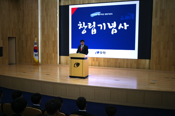 ▲최재호 무학그룹 회장이 4일 열린 창립 87주년 기념식에서 기념사를 하고 있다. (사진=무학)