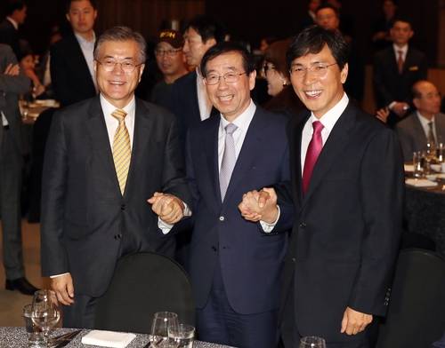▲왼쪽부터 더불어민주당 문재인 전 대표, 박원순 서울시장, 안희정 충남도지사가 3일 저녁 서울 여의도 63컨벤션 그랜드볼룸에서 열린 10·4남북정상선언 9주년 기념식에서 대화를 나누고 있다. (사진=연합뉴스)
