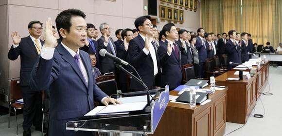 ▲5일 오전 경기도청 신관 4층 제1회의실에서 열린 2016년도 안전행정위원회 국정감사에서 남경필 경기도지사를 비롯한 간부공무원들이 증인선서를 하고 있다.(사진=경기도)