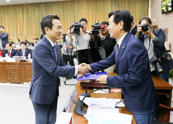 ▲남경필 경기도지사가 증인선서를 한 후 유재중 안전행정위원장에게 증인선서문을 전달하며 악수를 하고 있다.