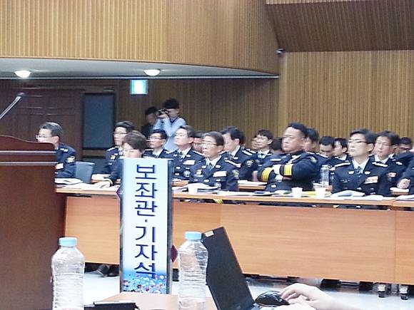 5일 오후 경기남부경찰청에 대한 국회 안전행정위원회의 국정감사에서 안행위 소속 이재정 국회의원(더불어민주당)이 의정부 소재 모 미군부대 인근에서 열린 집회를 예를들며 허가 당시 집회 위치를 조정한 이유에 대해 격분하며 경기북부청장에게 질의하자 경기남부경찰청 수뇌부가 심각한 표정으로 팔장을 낀 채 예의주시 하고 있다.