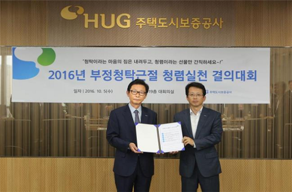 주택도시보증공사(HUG, 사장 김선덕)는 5일 부산국제금융센터HUG 대강당에서 부정청탁근절에 대한 현업의 강력한 실천공감대 형성과 청렴의식 강화를 위한 '부정청탁근절 청렴실천 결의대회'를 개최했다.