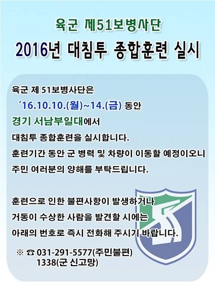 육군 제51보병사단은 오는 10일부터 14일까지 5일 동안 경기 서남부 일대(시흥부터 평택)에서 민․관․군․경 통합방위태세를 확립하기 위한 대침투 종합훈련을 실시한다고 6일 밝혔다.