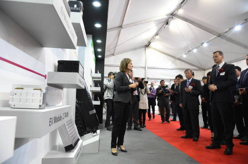 ▲5일(현지시각) 폴란드 브로츠와프에서 열린 ‘LG화학 폴란드 전기차 배터리 공장 기공식’ 행사장에서 구본무 LG회장(우측에서 2번째), 마테우쉬 모라비에츠키 폴란드 부총리(우측에서 첫번째) 등이 전시부스를 관람하고 있다. (사진=LG화학)