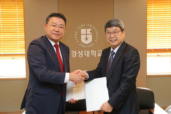 ▲오른쪽부터 경성대 송수건 총장, 해양플랜트엔지니어링협동조합 김용휘 이사장. (사진=경성대)