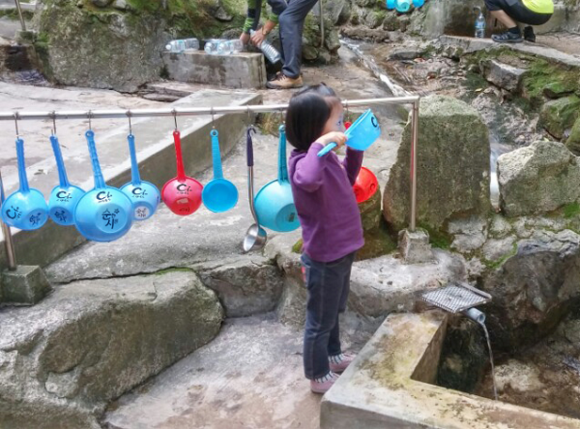 ▲부산 장전동 삼밭골 약수터를 찾은 어린이가 시원블루 약수바가지로 물을 마시고 있다. (사진=대선주조)