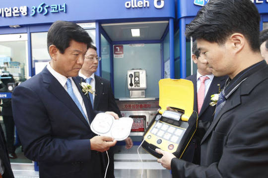 ▲지난 2011년 당시 조준희(왼쪽) 기업은행장이 서울역 광장의 길거리 점포에 설치돼 있는 자동심장 충격장치를 살펴보고 있다. (사진=기업은행)