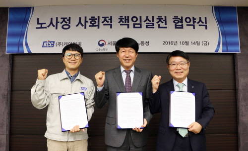 KCC는 지난 14일 오후 서울 서초동 KCC 본사에서 서울지방고용노동청과 고용안정, 일자리 창출, 지역사회 및 협력업체와의 동반성장을 위한 ‘원·하청 상생 및 노·사·정 사회적책임 실천 협약식’을 가졌다고 17일 밝혔다.