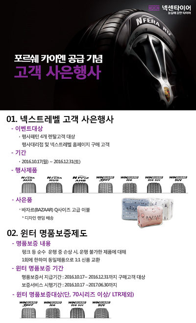 넥센타이어(대표이사 강호찬)가 포르쉐 카이엔 공급을 기념해 렌탈 고객을 대상으로 사은 이벤트 및 윈터 명품보증제도를 실시한다.