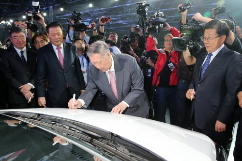 ▲정몽구 현대차그룹 회장이 창저우공장의 첫 번째 생산 모델인 위에나에 기념 사인을 하고 있는 모습. (사진=현대자동차)