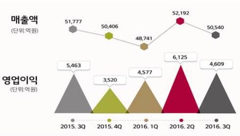 이는 전분기와 대비해 매출은 3.2%, 영업이익은 24.7%, 순이익은 20.4%가 각각 감소한 수치이며, 전년동기와 대비해서는 매출은 2.4%, 영업이익은 15.6%, 순이익은 12.7%가 감소한 실적이다.