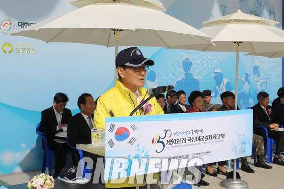 ▲김덕남 상이군경회장이 지난 12일∼13일 이틀간 보훈재활체육센터 열린 ‘제50회 전국상이군경체육대회’에서 인사말을 하고 있다. (사진=상이군경회 제공)