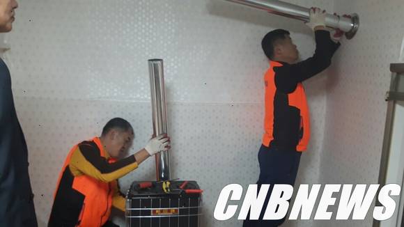 ▲전현길 인제읍의용소방대장과 이영화 대원이 연탄난로를 설치하고 있다.
