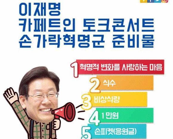 기초단체장으로서는 사상처음 대선 여론조사에서 5위로 성큼 뛰어오르고 SNS대통령으로 불리우고 있는 이재명 성남시장이 일명 손가락 혁명군으로 불리는 전국의 SNS친구들을 불러 모으고 있다. 손가락혁명을 위한 비상소집이라는 것이다.