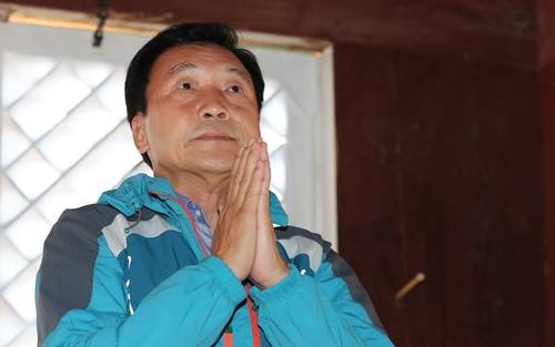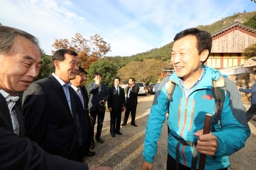 ▲손학규 전 민주당 대표가 20일 오전 정계 은퇴 선언 후 2년여간 생활하던 전남 강진군 백련사 인근 토담집에서 나와 하산하며 불공을 올리고 있다. 손 전 대표는 이날 오후 국회 정론관에서 정계복귀를 선언한다.(강진=연합뉴스)