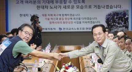 ▲지난 14일 윤갑한 현대차 사장(오른쪽)과 박유기 노조위원장이 올해 임금협상 타결 조인식에서 악수하고 있는 모습. (사진=연합뉴스)