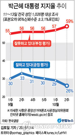 여론조사 전문기관 한국갤럽이 18~20일 사흘간 전국 성인 1천18명에게 조사해 21일 발표한 10월 셋째주 주간 정례 조사에 따르면 박 대통령이 대통령으로서 직무를 잘 수행하고 있다고 보는지 묻는 질문에 지난주 대비 1%p 하락한 25%가 긍정 평가해 취임후 최저치를 경신한 반면에 부정평가는 전주보다 5%p나 급등한 64%를 기록하며 역시 취임후 최고치를 갈아치웠으며, 12%는 의견을 유보했다(어느 쪽도 아님 4%, 모름/응답거절 8%).