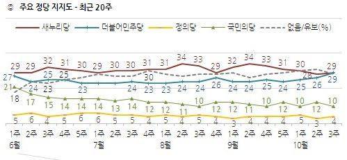 정당지지율을 살펴보면 새누리당이 ‘송민순 회고록’을 계기로 전방위 적으로 색깔공세를 펴고 있음에도 불구하고 더불어민주당 지지율이 전주보다 3%p 올라 올해 최고치를 경신한 29%를 기록하며 1%p 오른 새누리당과 박근혜 정부 출범 후 처음으로 공동 1위를 차지했으며, 국민의당은 2%p 하락한 10%였고, 정의당은 1%p 오른 4%였다. 없음/의견유보는 28%로 나타났다.