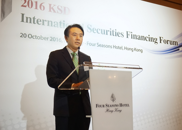 ▲유재훈 예탁결제원 사장이 20일 홍콩에서 열린 '2016 KSD 국제 증권파이낸싱 포럼'에서 환영사를 하고 있다. (사진=예탁결제원)