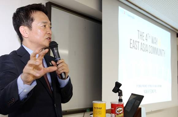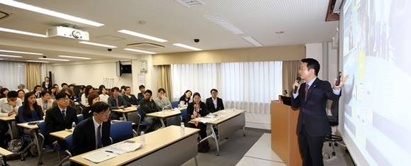 ▲일본 반도체 기업 투자유치 등을 위해 일본을 방문 중인 남경필 경기도지사가 일본 현지시각 24일 오후 도쿄대 혼고 캠퍼스에서 학교 임직원과 학생을 대상으로 ‘제4의 길-함께 만드는 미래’를 주제로 특별강연을 하고 있다.(사진=경기도)