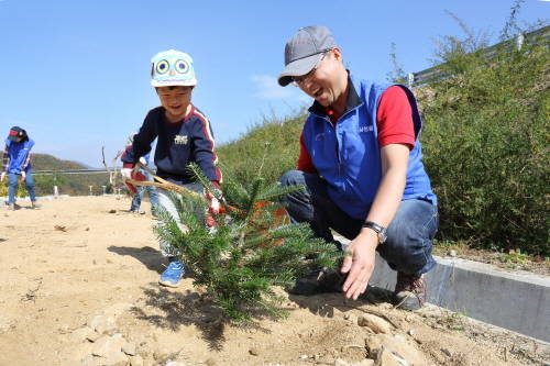 ▲아이와 함께 마을공원 조성 봉사활동을 펼치고 있는 삼성물산 직원의 모습. (사진=삼성물산)