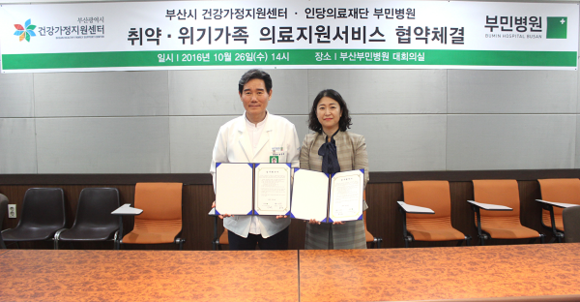 부민병원(이사장 정흥태)은 26일 부산부민병원 대회의실에서 부산시 건강가정지원센터(센터장 홍선영)와 취약·위기가족의 건강을 위한 의료지원 협약을 체결했다.