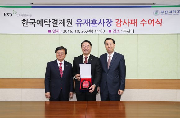부산대학교 경제통상대학(학장 김영재)은 26일 오전 대학본관 5층에서 지역과 대학 발전을 위해 부산대 경제통상대학과 실질적인 산학협력을 선도적으로 실천한 공로로 부산 이전 금융공기업인 한국예탁결제원 유재훈 사장에게 감사패를 전달했다.