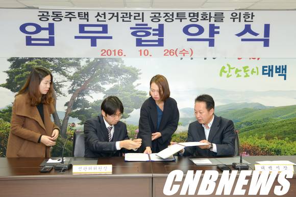 태백시(시장 김연식)와 태백시선거관리위원회(위원장 한동석)는 26일 오후 5시 태백시청 소회의실에서 공동주택 선거관리의 공정·투명화를 위한 업무협약식을 개최했다. 협약에 따라 양 기관은 공동주택 임원 선거에 대한 불신이 해소될 수 있도록 적극 동참하기로 했다. 이에 따라 태백시선관위는 공동주택 선거관리에 대해 위원회의 축적된 선거 노하우와 서비스를 제공하고 태백시는 온라인 투표서비스의 활용을 유도함으로써 공동주택 선거 관리의 공정·투명성을 통해 화목하고 살기 좋은 아파트 환경 조성에 기여한다.