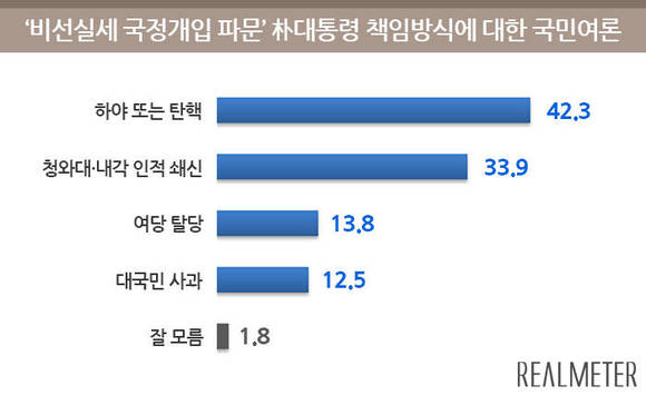리얼미터가 박 대통령의 책임방식에 대한 긴급 여론조사에 따르면 ‘하야 또는 탄핵해야 한다’는 응답이 42.3%로 다른 방식보다 오차범위 밖에서 우세한 것으로 높게 나타났다. ‘청와대 비서진과 내각의 전면적 인적쇄신’은 21.5%, ‘여당 탈당’은 17.8%, ‘대국민 사과’는 10.6%로 집계됐다. ‘잘 모름’은 7.8%.
