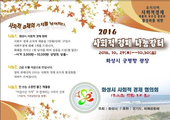 화성시가 우리지역 사회적경제 제품의 우수성 홍보를 위해 오는 29일부터 30일까지 양일간 서신면 궁평항 광장에서 2016 사회적경제 나눔장터를 연다.