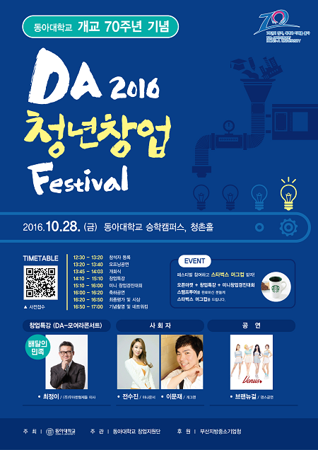 동아대가 학생들의 적극적인 진로 개척을 위해 '개교 70주년 청년창업 Festival'를 28일 낮 12시 30분부터 오후 5시까지 승학캠퍼스 청촌홀 1층에서 개최한다.