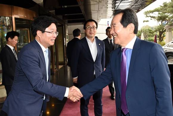 ▲정세균 국회의장이 28일 수원에서 열린 지방분권개헌 500인 원탁토론에 참석해 염태영 수원시장과 악수를 하고 있다.(사진=수원시)