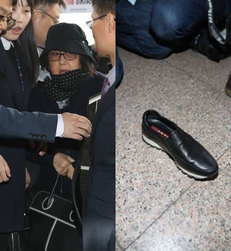 ‘비선실세’로 지목받는 최순실(최서원)씨가 31일 서울 서초구 서울중앙지검에 출석 도중 한 쪽 신발이 벗겨져 출입문 인근에 놓여 있는 것이 카메라에 포착됐다. 벗겨진 구두는 명품 브랜드 ‘프라다’로 알려졌다.