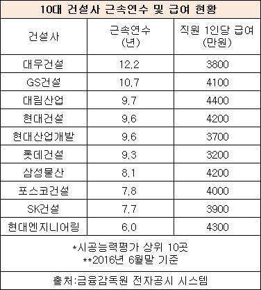 금융감독원 전자공시시스템에 공시된 시공능력평가 상위 10대 건설사의 반기보고서를 CNB가 분석한 결과 올해 6월말 기준 근속연수가 가장 긴 건설사는 12.2년의 대우건설로 나타났다.