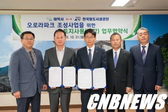 태백시(시장 김연식)는 31일 오후 3시 투자상담실에서 김연식 시장과 노병국 철도시설관리공단 강원지역본부 본부장 및 시 전략사업과장, 철도 공단 김충기 부장 등이 참석한 가운데 '오로라파크 조성사업' 위한 토지사용 업무협약을 체결했다.