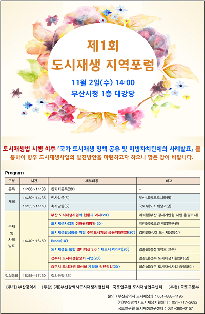 이상흔 부산시 도시재생과장은 “이번 포럼을 통해 부산시 도시재생 선도지역사업의 경험을 타 지자체와 공유하고 우리나라 도시재생 정책에 대해 더 깊이 이해할 수 있는 계기가 되어, 현재 진행되고 진행되고 있는 정부 및 지방자치단체의 도시재생사업의 성과를 높이는 계기가 될 수 있도록 바란다”고 밝혔다.