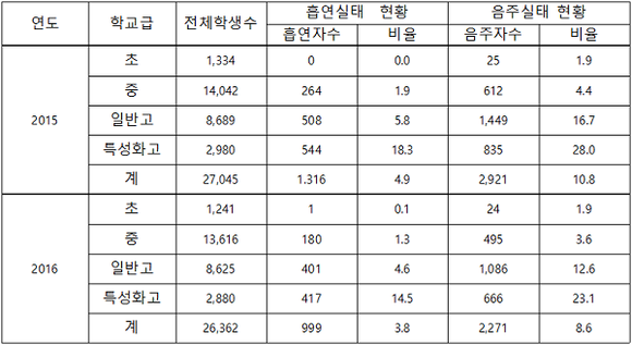 부산시교육청은 '2016학년도 학생 흡연·음주 실태조사' 결과 부산지역 초·중·고 학생들의 흡연율과 음주율이 지난해보다 소폭 줄어든 것으로 나타났다고 1일 밝혔다.