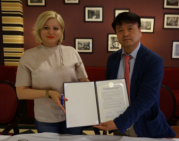 ▲업무양해각서를 체결하는 아스타나 패밀리클리닉 올가 병원장(왼쪽)과 고신대복음병원 최영식 부원장. (사진=고신대복음병원)