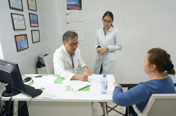 ▲제2거점센터가 설치되는 아스타나 패밀리클리닉에서 카자흐스탄 환자를 진료하는 고신대복음병원 신동훈 교수.