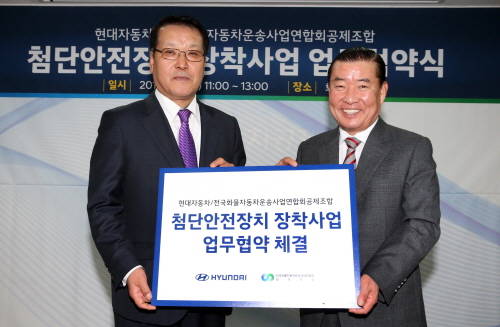 ▲대형 상용차 첨단안전장치 시범사업 업무 협약식에 참석한 (왼쪽부터)현대자동차 상용사업본부장 유재영 전무와 화물공제조합 신한춘 회장의 모습. (사진=현대자동차)