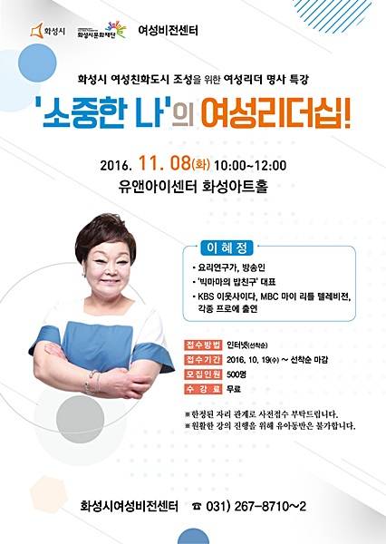 화성시 여성비전센터 주관으로 마련된 이번 특강은 ‘소중한 나의 여성리더십'이란 주제로 평범한 주부의 삶에서 유명 요리연구가가 되기까지 희로애락 인생사와 함께 나를 소중히 여기는 마음이 나를 발전시키는 원동력이 된다는 꿈과 희망의 메시지를 전달할 예정이다.