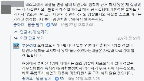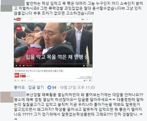 27일 오후 2시 8분, 한 페이스북 이용자가 부산경찰 페이스북에 “벡스코에서 학생들 연행 할때 미란다의 원칙에 근거 하지 않은 채 집행했다는 게 사실인지요 . 불법시위 진압이라고 해서 공무집행에 기본적인 절차도 지키시지 않으신다면 그건 대한민국 민주국가의 경찰로서의 자질을 스스로 버리는 거라고 생각합니다 부디 공권력을 남용하지 말아주세요”라는 글을 남겼다.