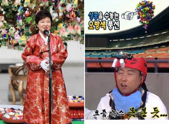지난달 29~30일 지상파 인기예능 프로인 ‘무한도전’ ‘슈퍼맨이 돌아왔다’ ‘런닝맨’과 주말극 ‘옥중화’에서는 ‘최순실-박근혜 게이트’를 비꼬는 듯한 ‘온 우주’(런닝맨) ‘오방색 풍선’(무한도전) ‘오방낭’(옥중화) 등이 자막과 연출을 통해 일제히 등장했다. SNS에는 최씨와 박 대통령을 비난하는 글이 연일 봇물을 이루고 있다. 심지어 세월호 사건 당일 날 대통령의 ‘사라진 7시간’을 두고 굿판을 벌인 것 아니냐는 얘기까지 나온다.