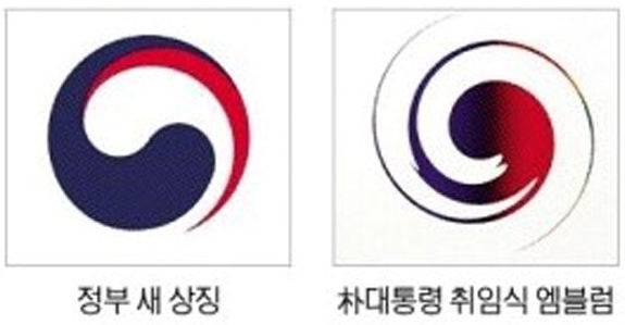 ▲올해 3월 확정된 정부상징. 문양과 색깔이 최순실 씨가 대통령 취임식 때 선택한 엠블럼(오른쪽)과 상당히 비슷하다.