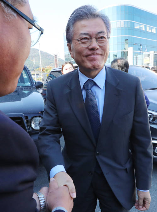 ▲더불어민주당 문재인 전 대표가 2일 오후 전남 나주시의 한 식당에 나주학생독립운동 후손 등과 오찬하기 위해 들어서며 악수하고 있다.(나주=연합뉴스)